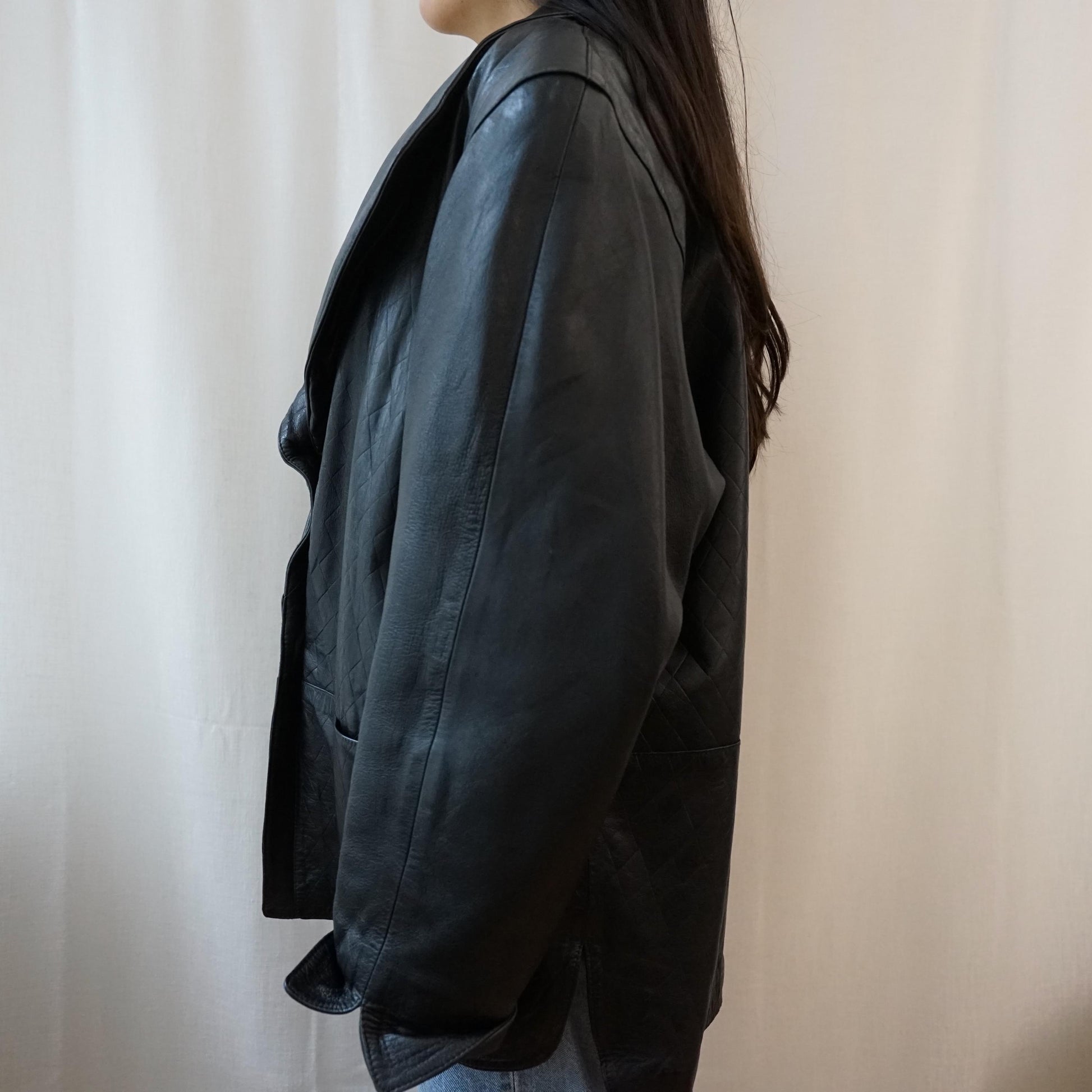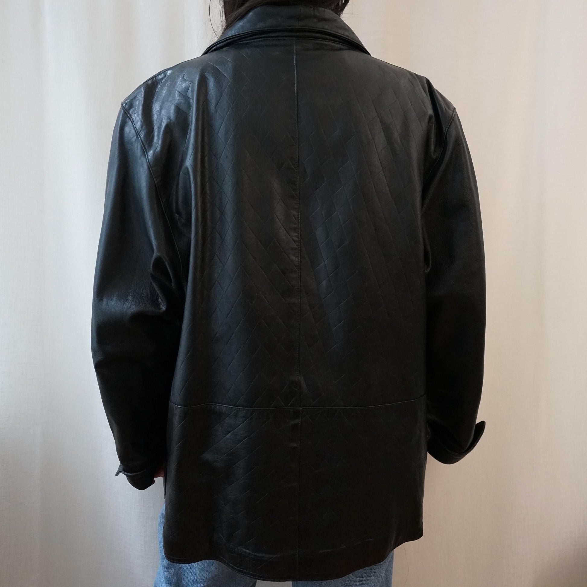 Vintage black leather jacket from the 80s with a quilted green lining and shoulder pads