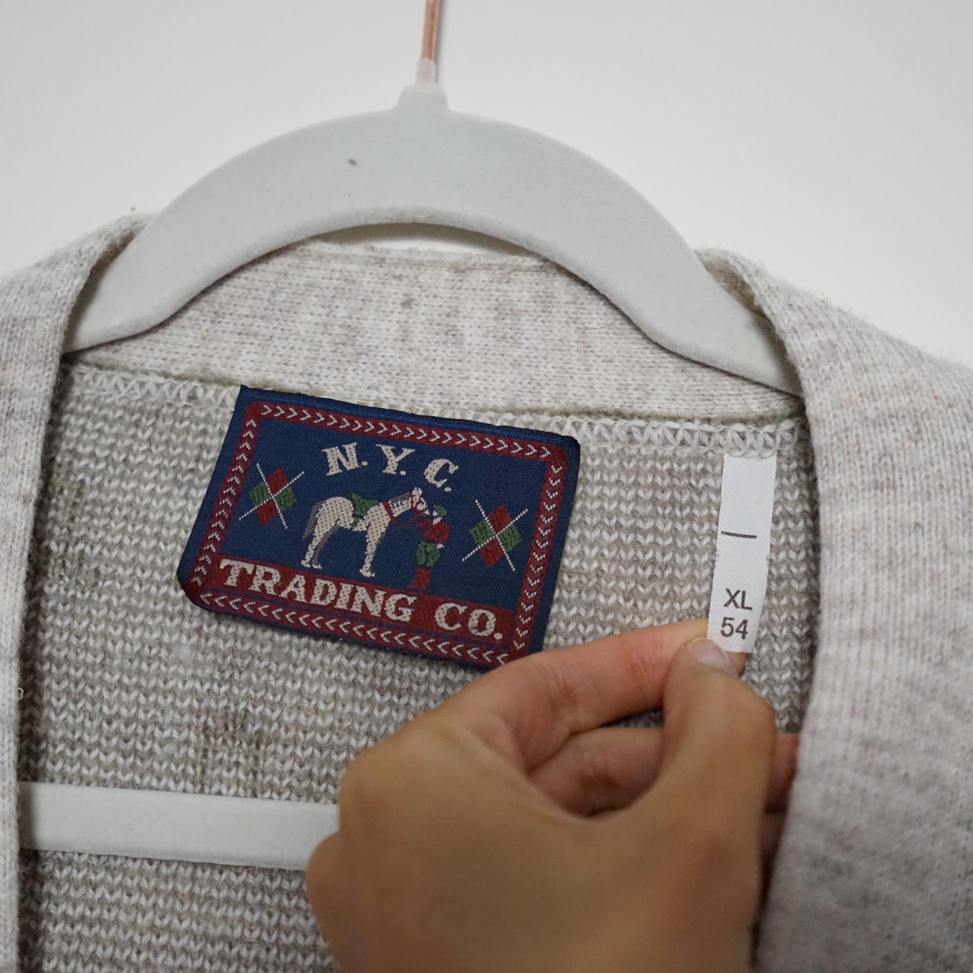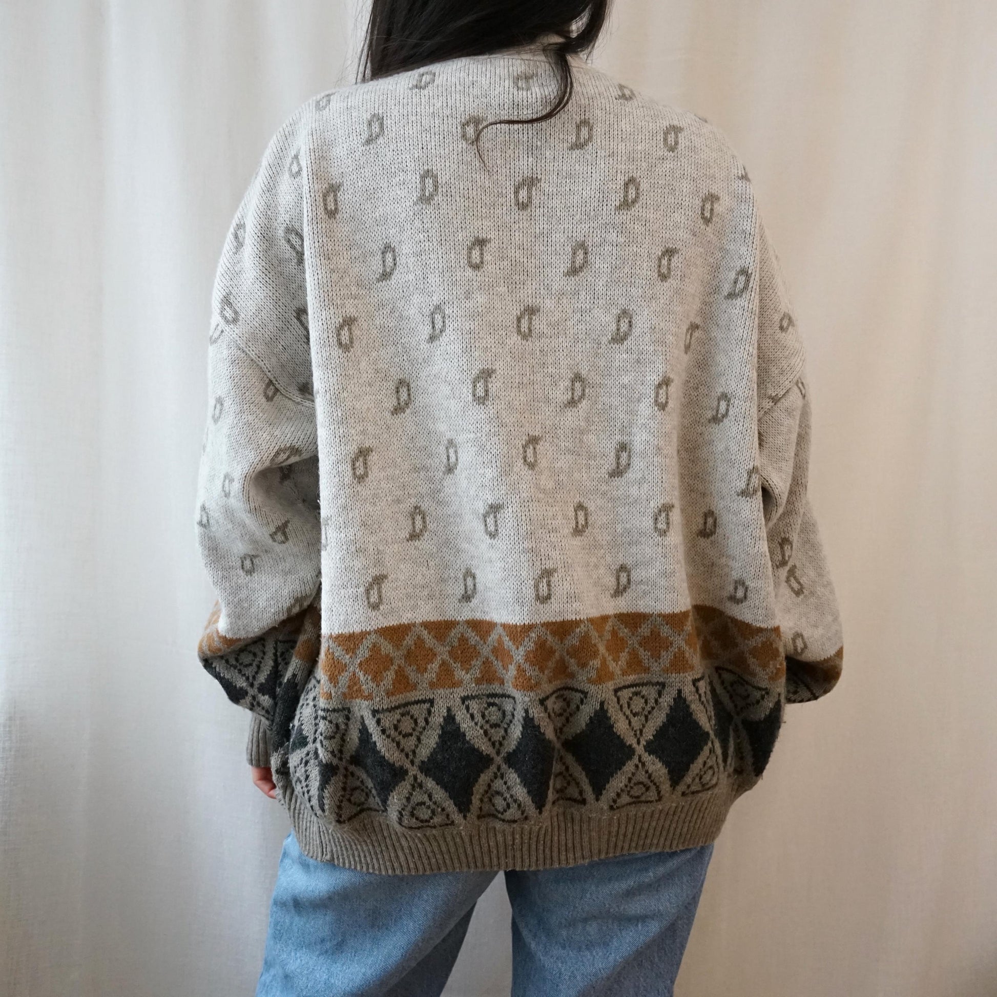 Vintage cardigan in a beige color with grey and yellow details and an embroidered image