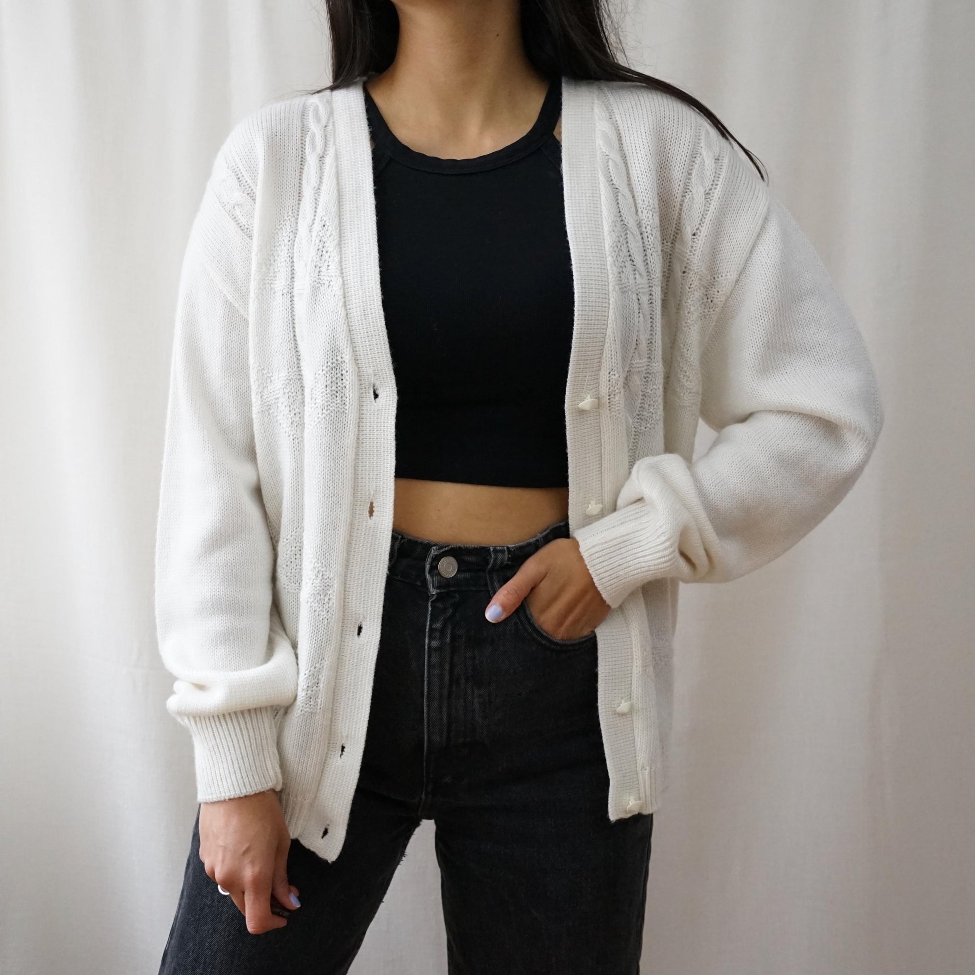 Vintage white grandma cardigan with cable knit pattern