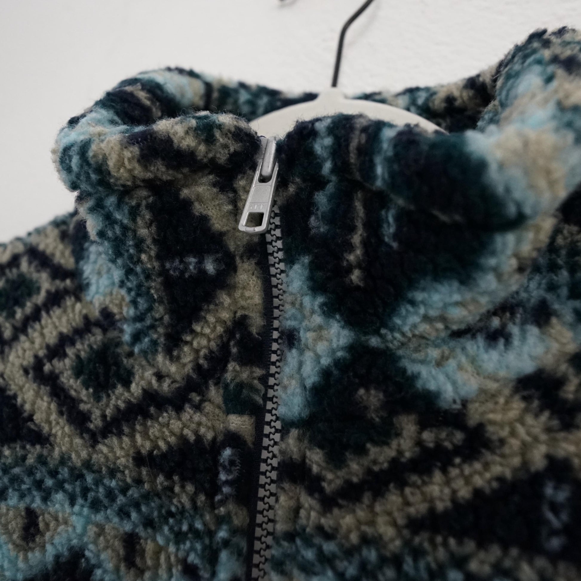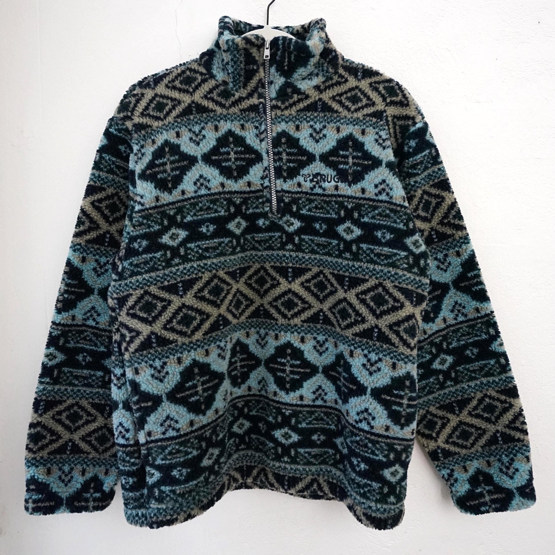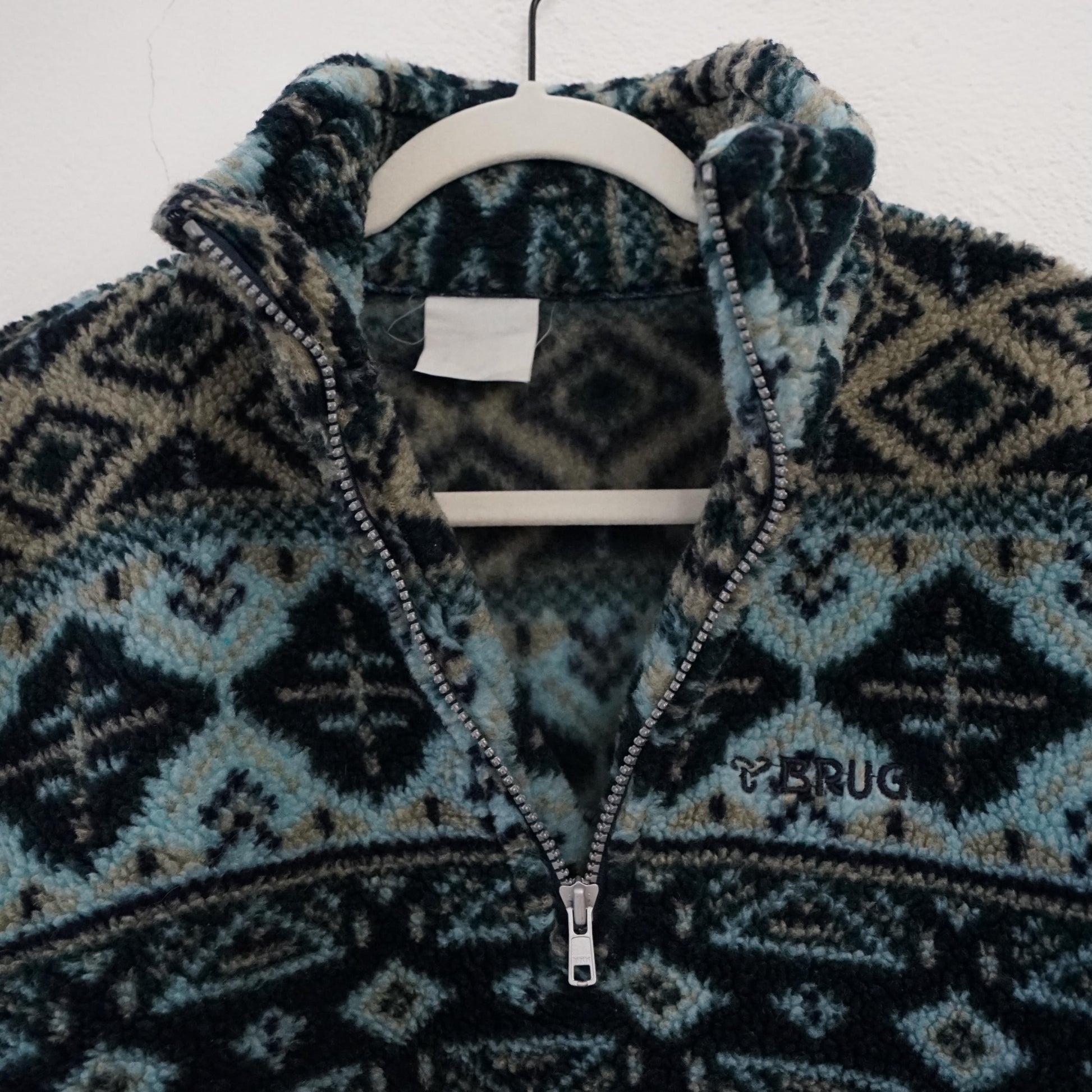 Vintage 90s blue fleece pullover with geometric pattern, quarter zip and pockets