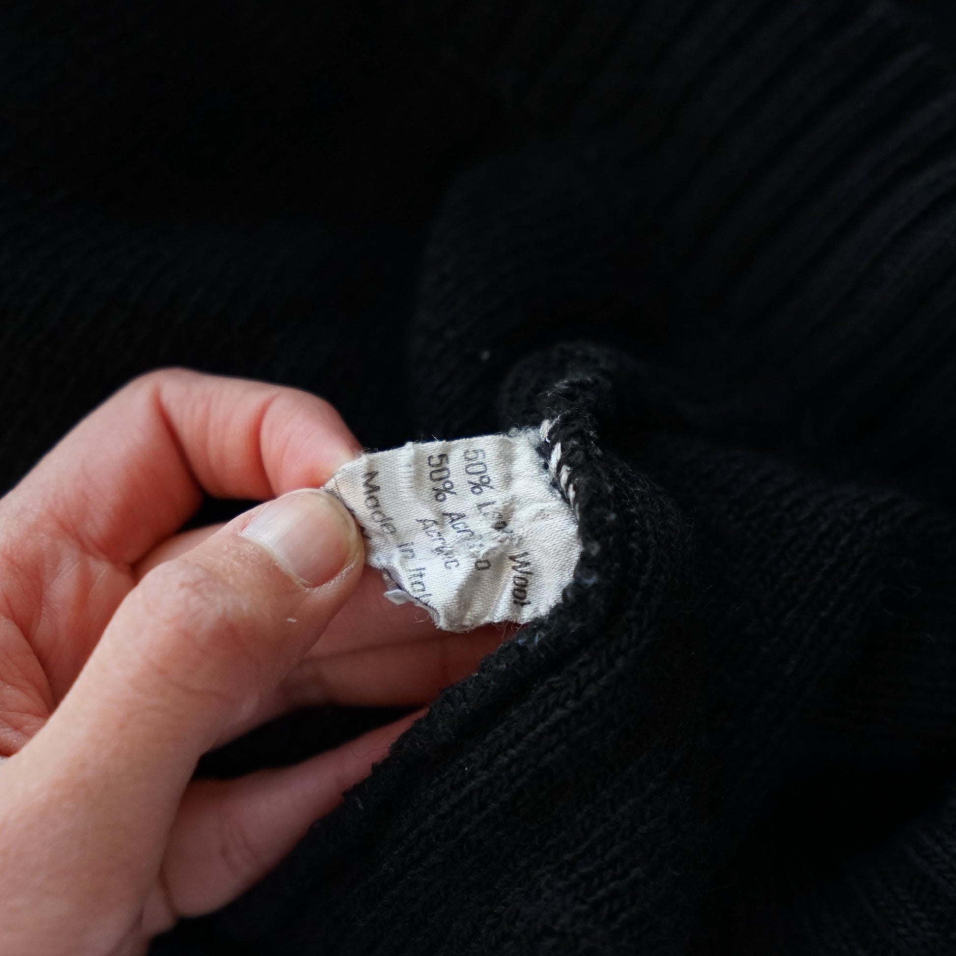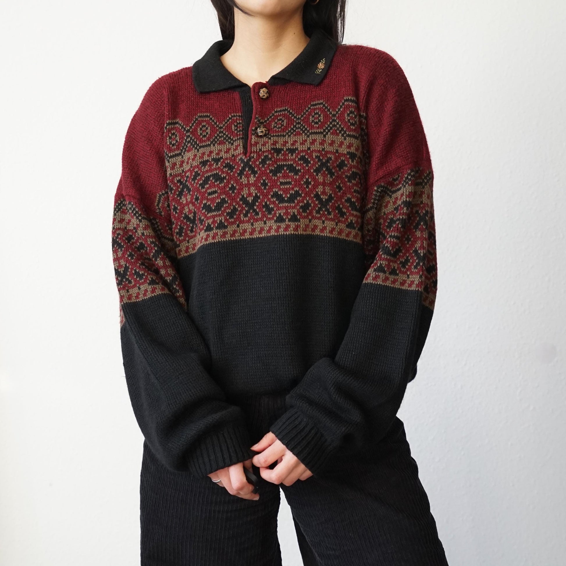 Vintage black and red polo pullover with black and brown geometric pattern and embroidered details on collar.