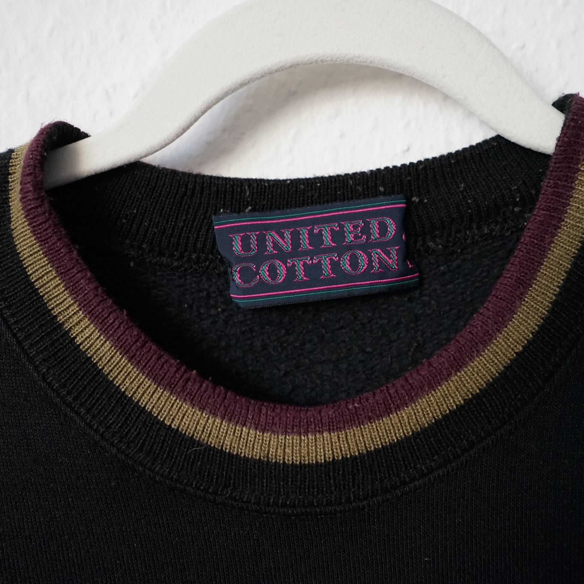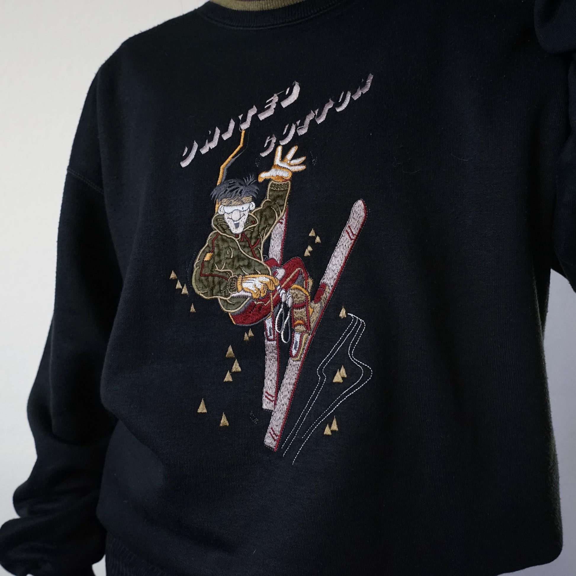 Vintage black cotton pullover with amazing embroidered image of a person skiing and United Cotton Logo