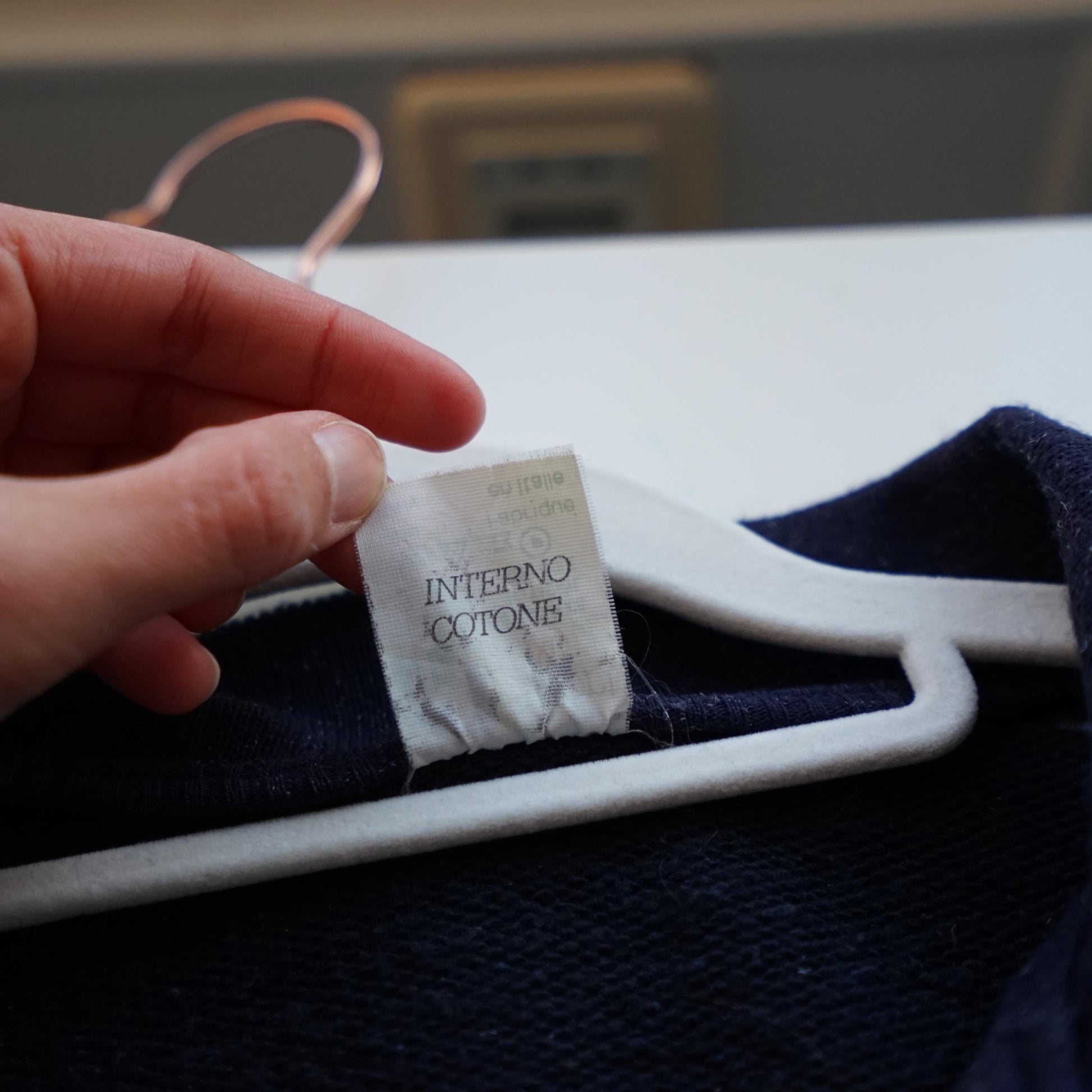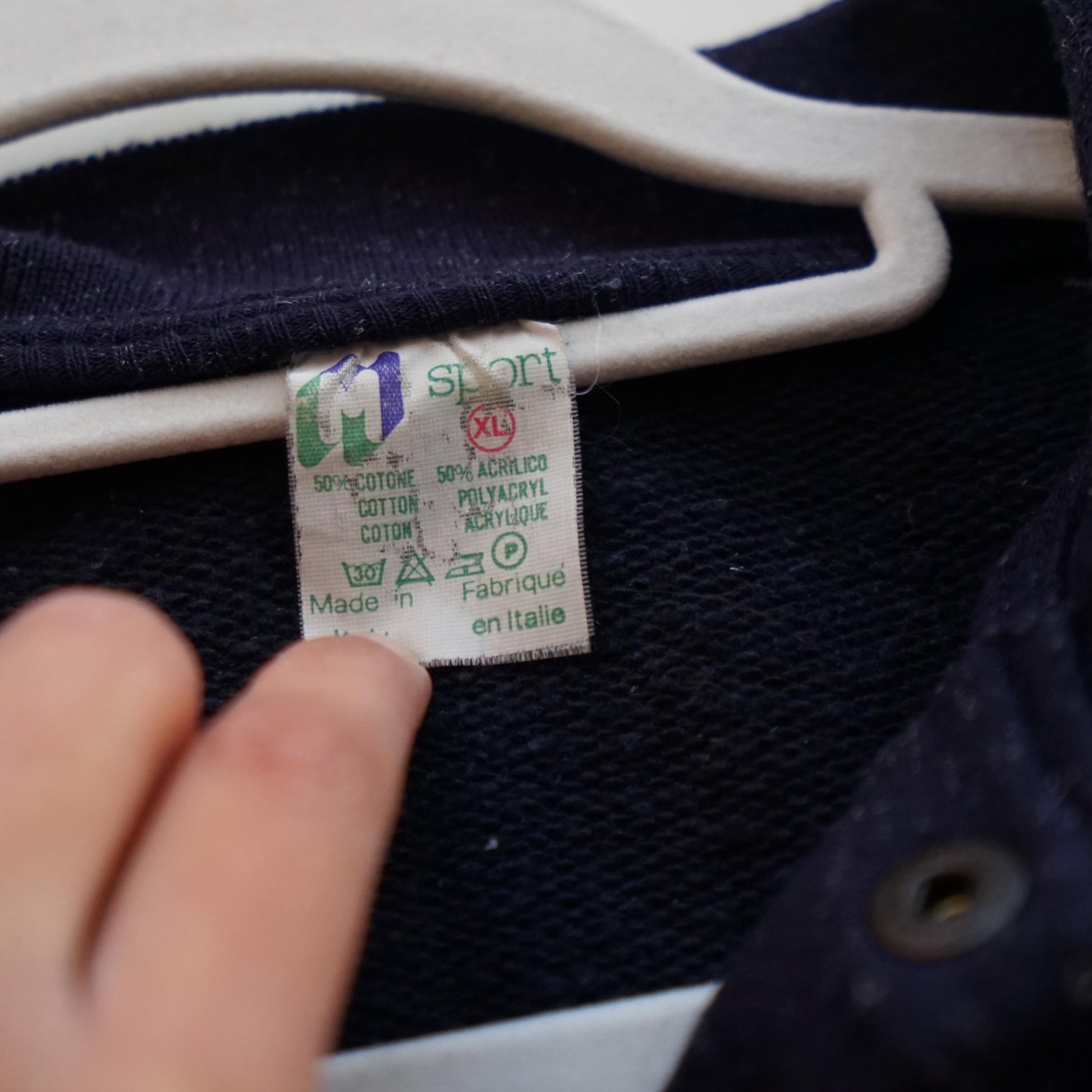 Vintage blue polo sweatshirt with red details and embroidery of people moving