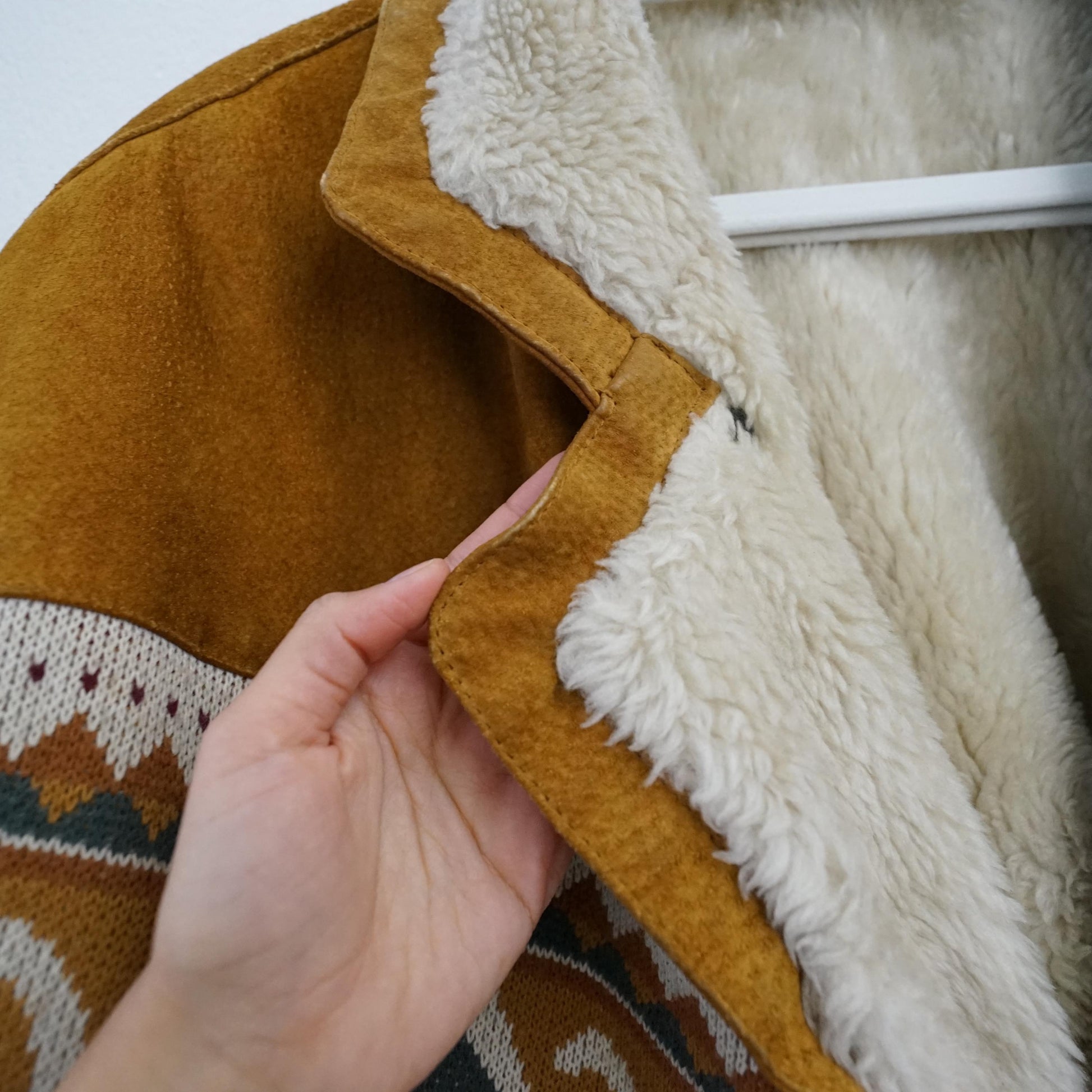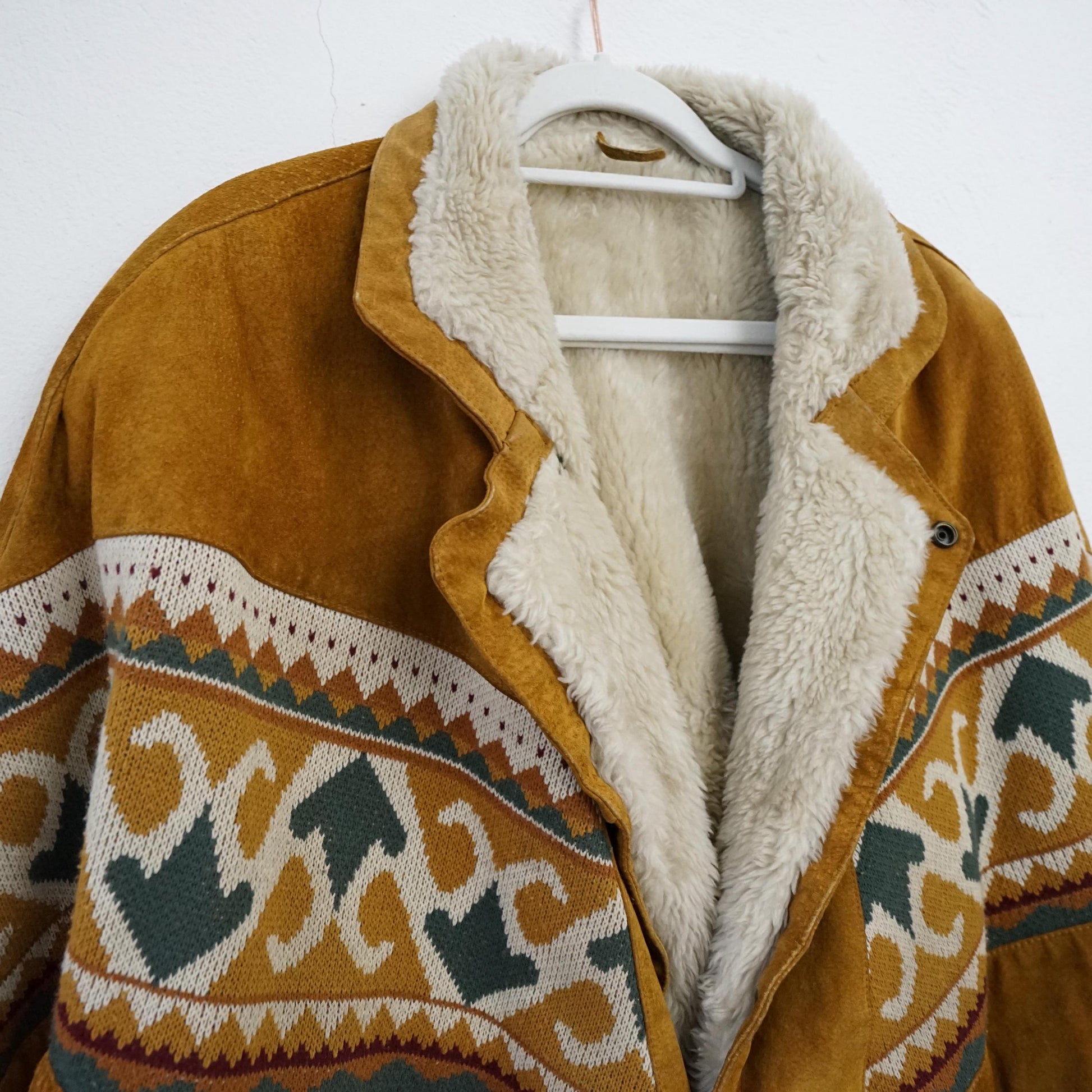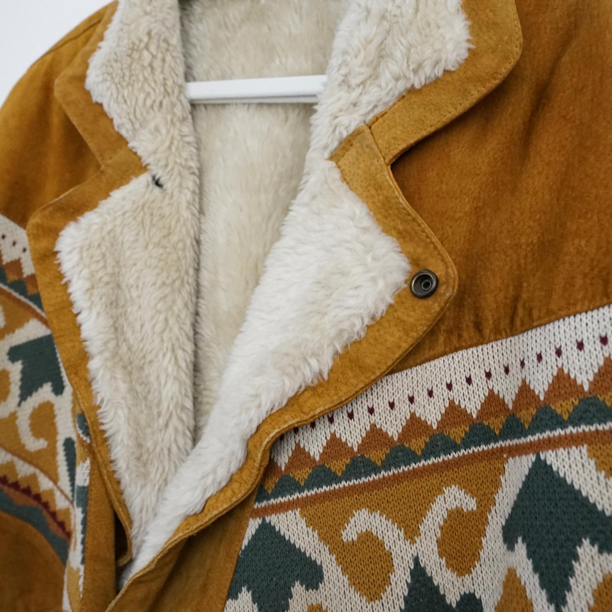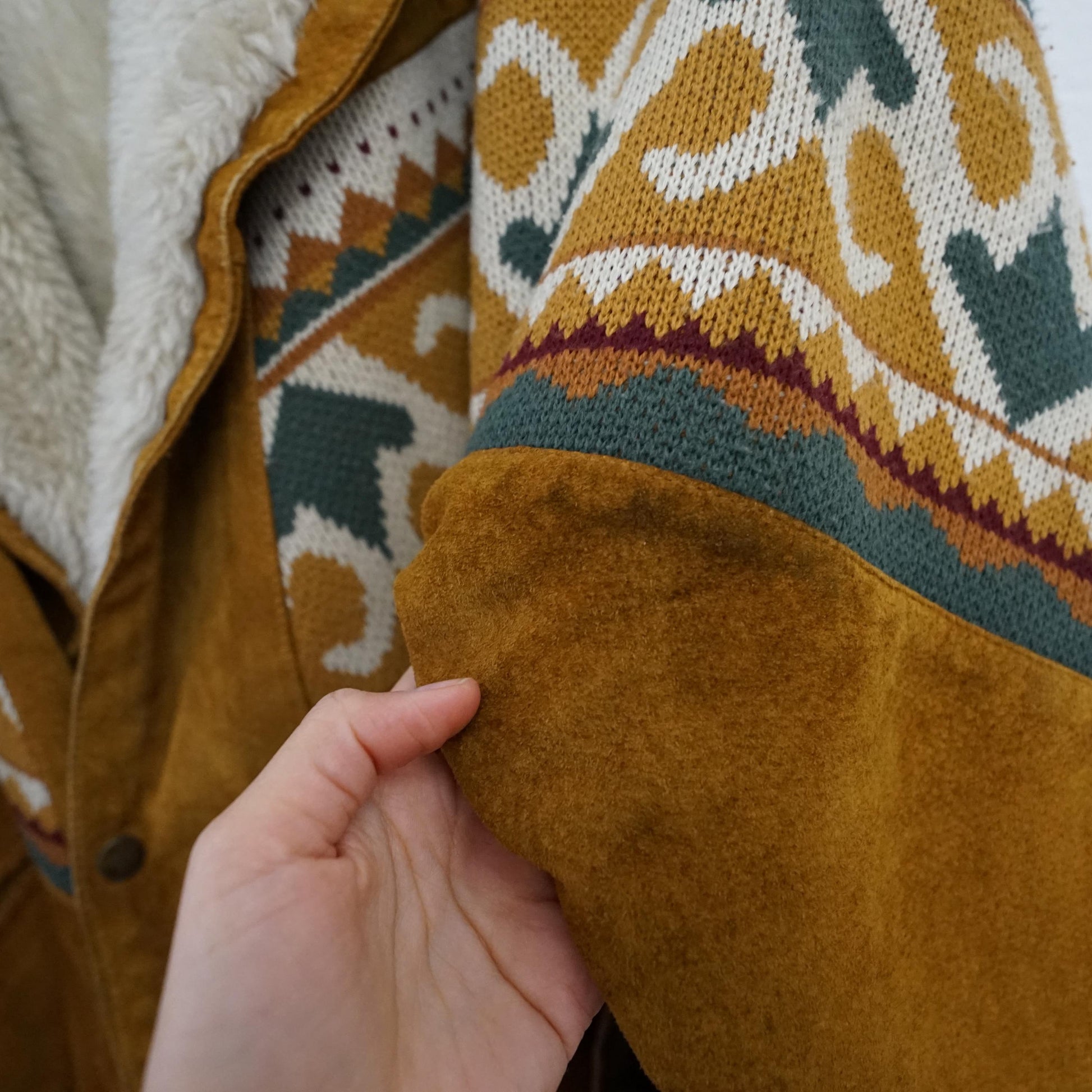 Vintage beautiful yellow suede bomber jacket with knitted details and super cozy teddy lining