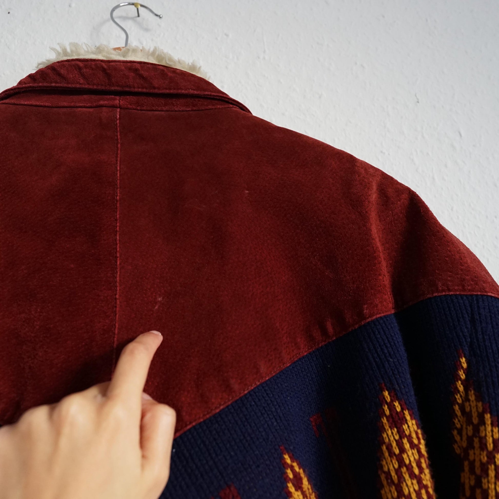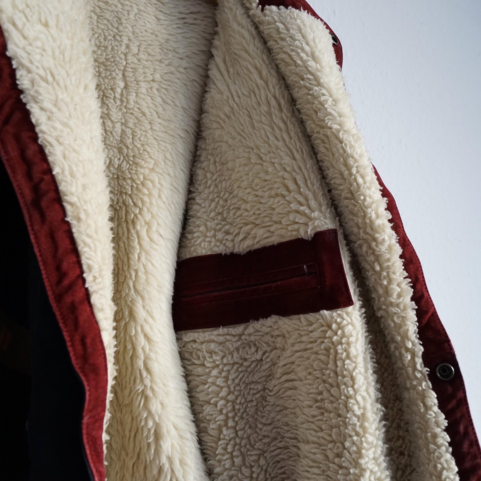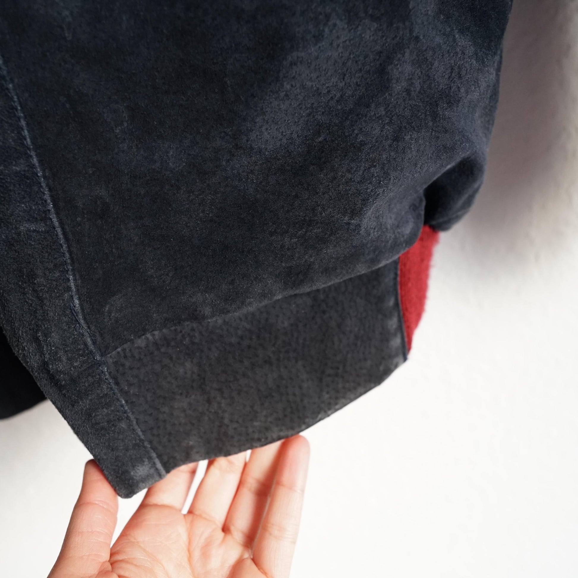 Vintage beautiful red and dark grey suede bomber jacket with cozy teddy lining