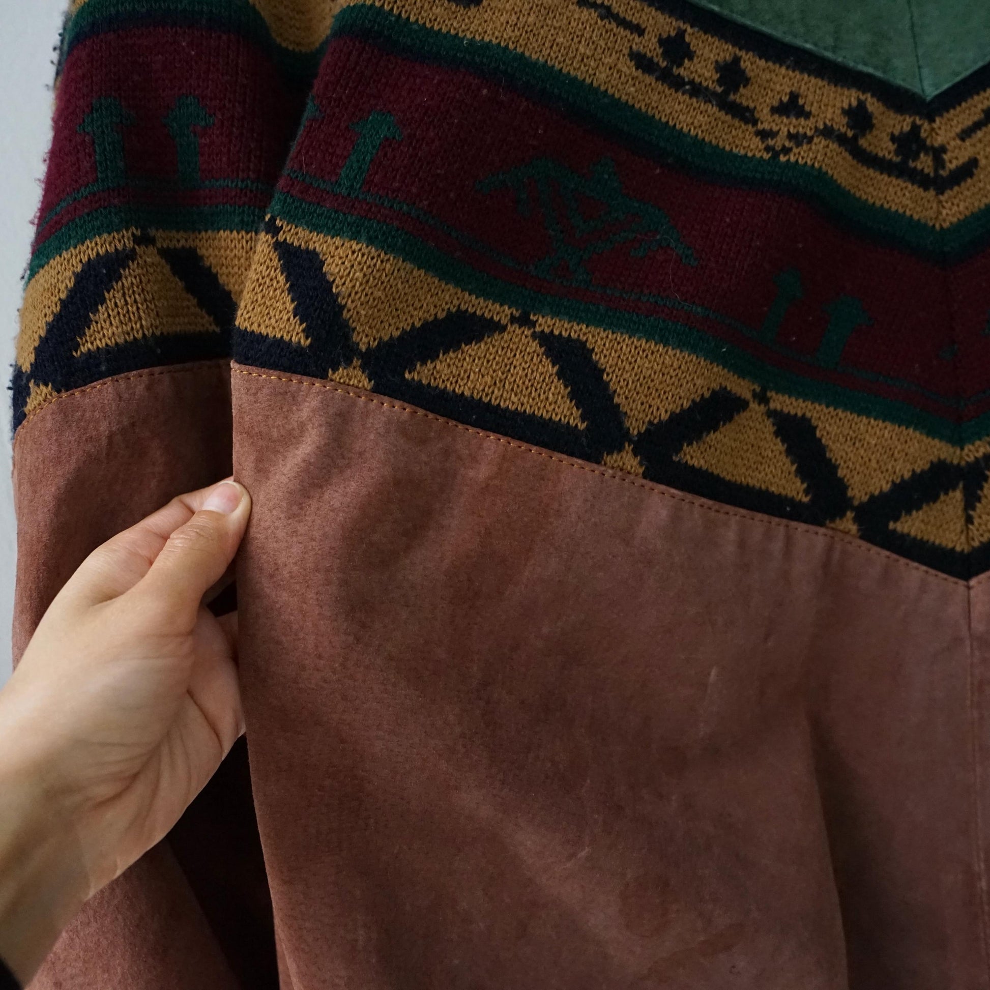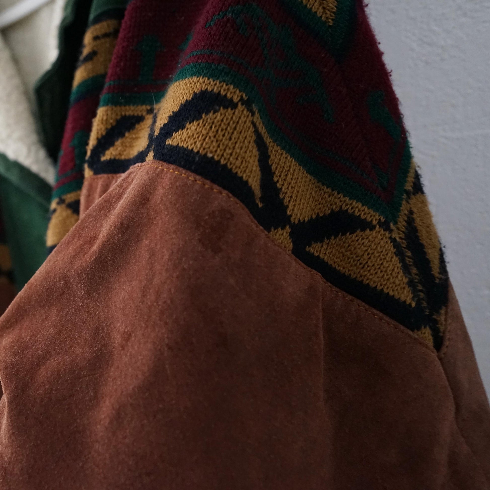 Vintage teddy suede jacket in brown and green with knitted geometric pattern