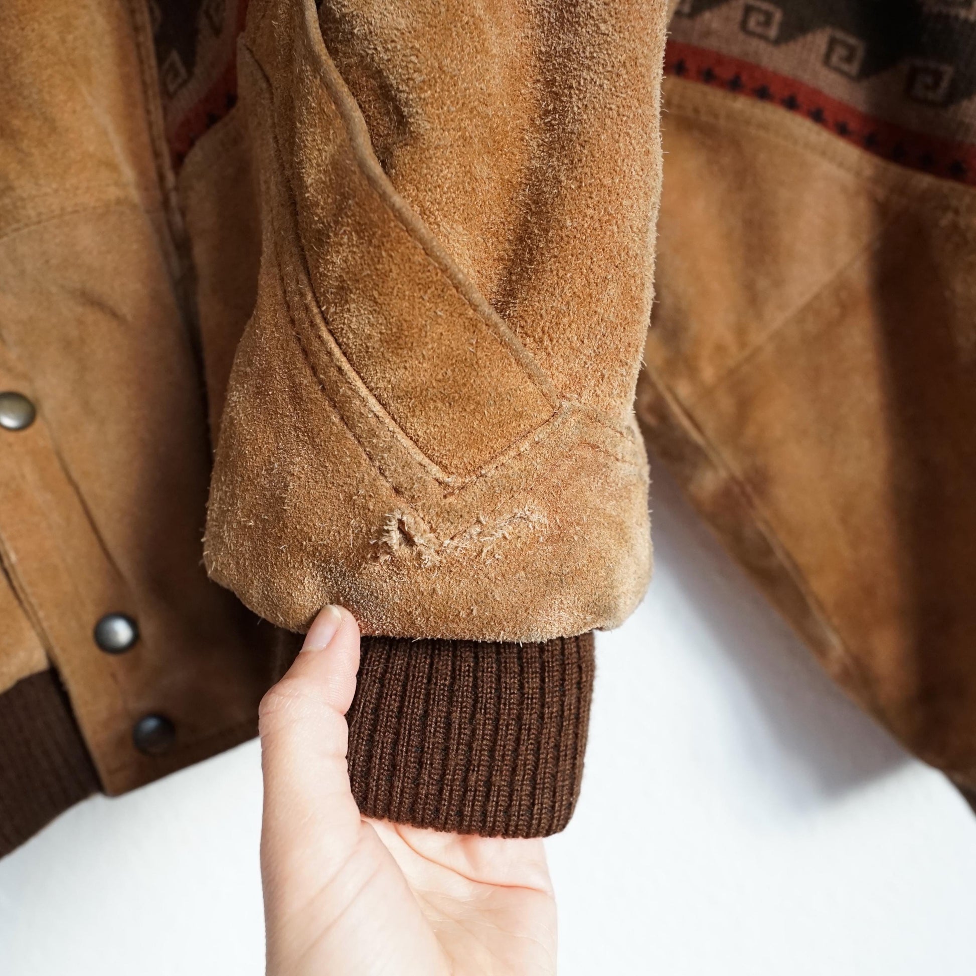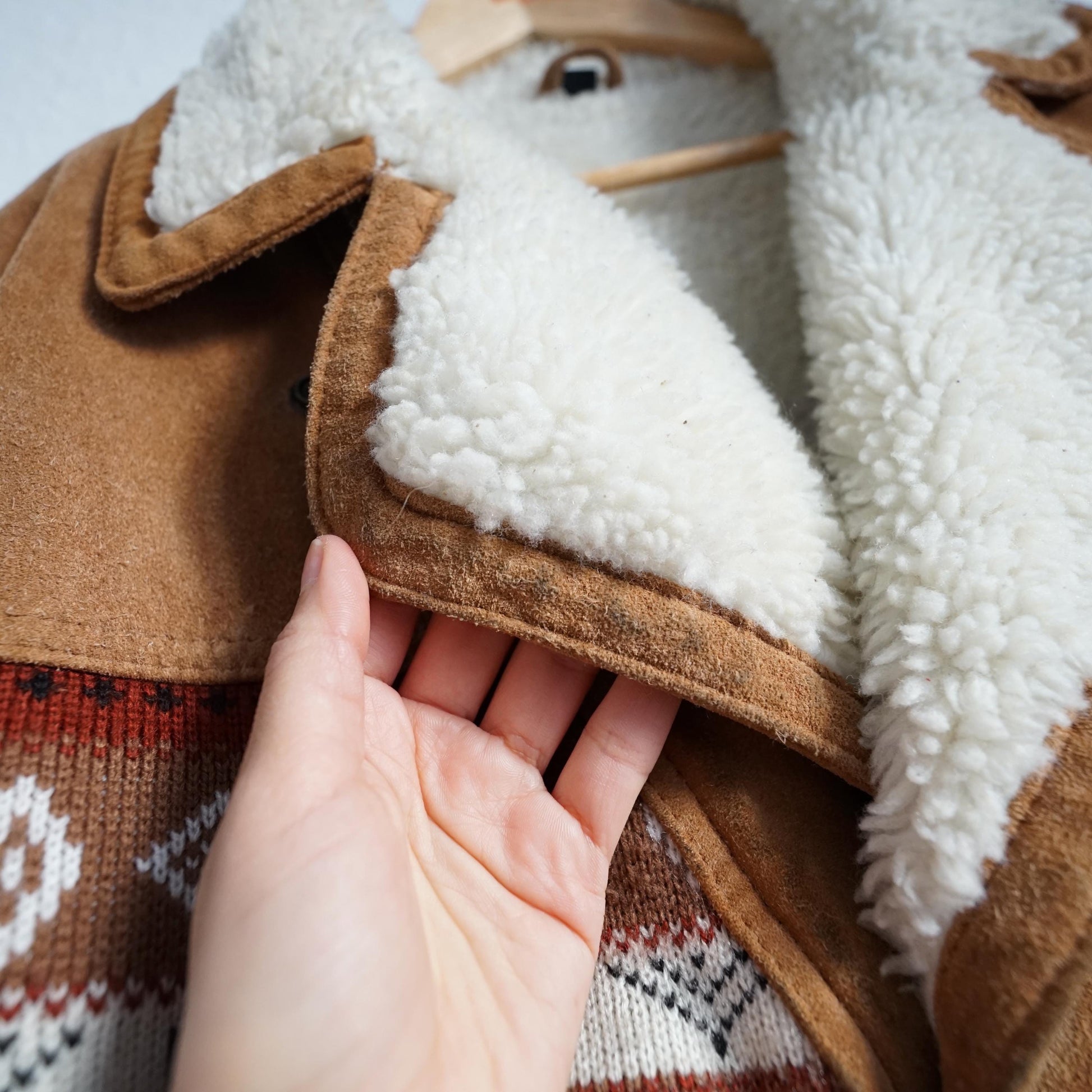 Vintage suede bomber jacket in light brown with beautiful knitted details and white teddy lining. Some damages, therefore lower price!