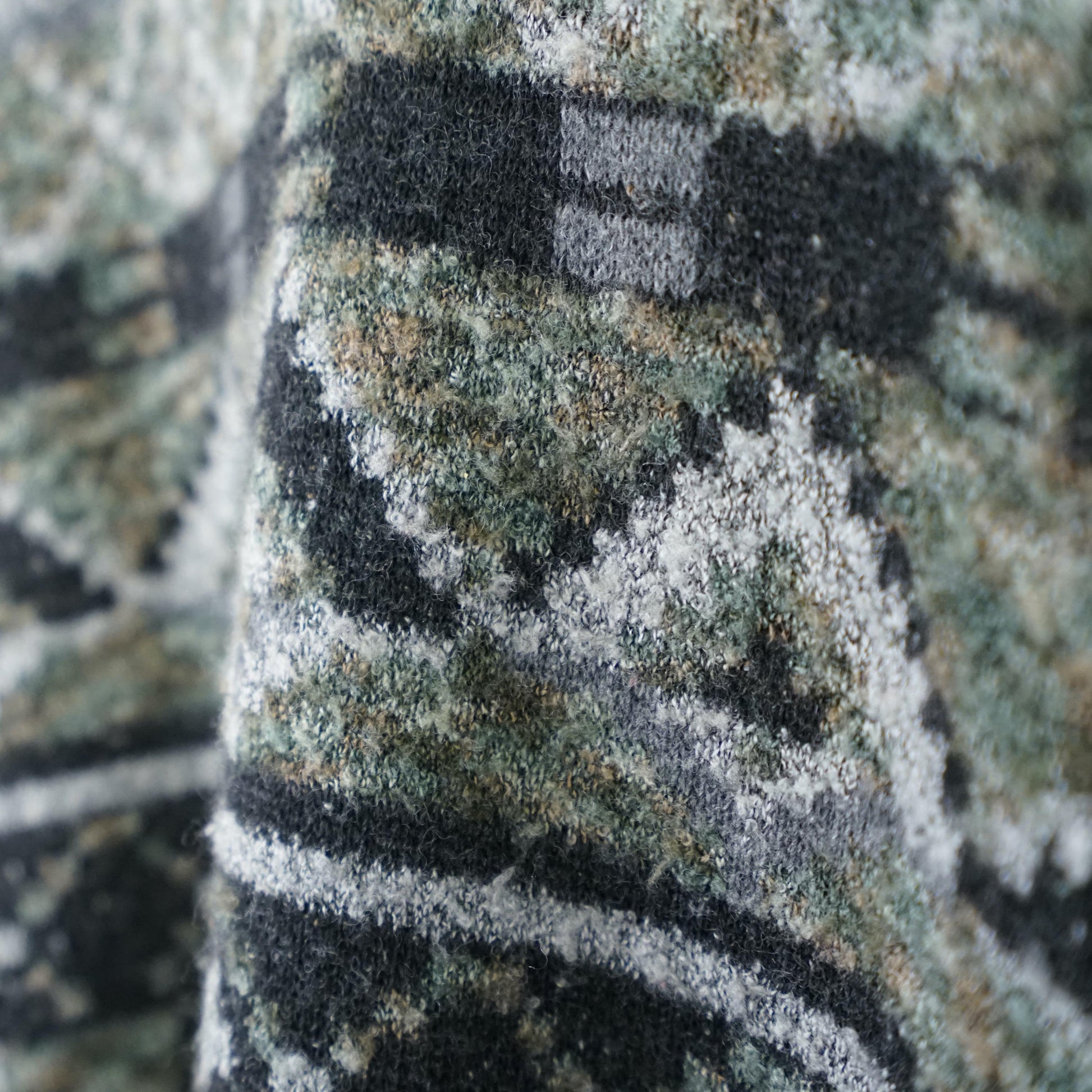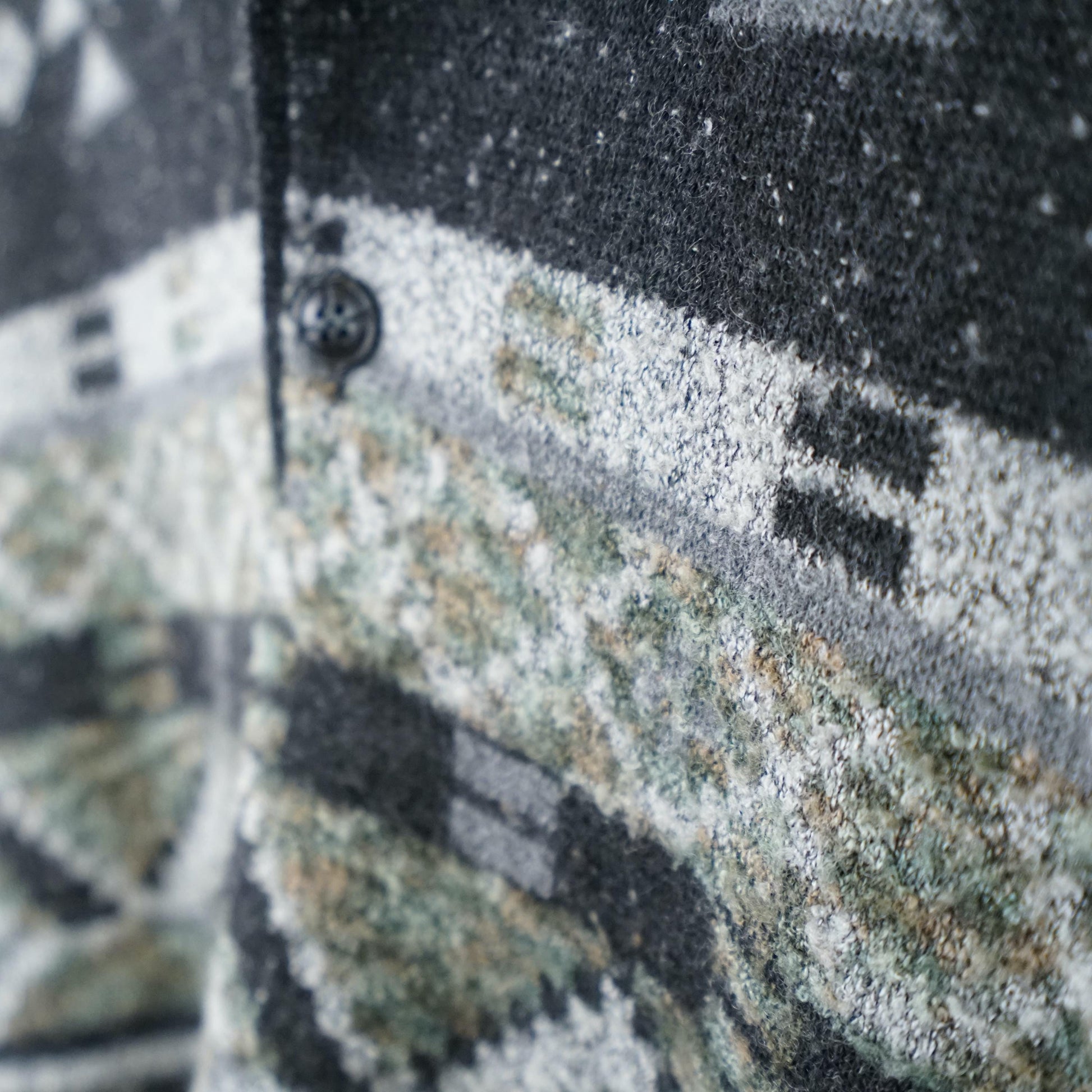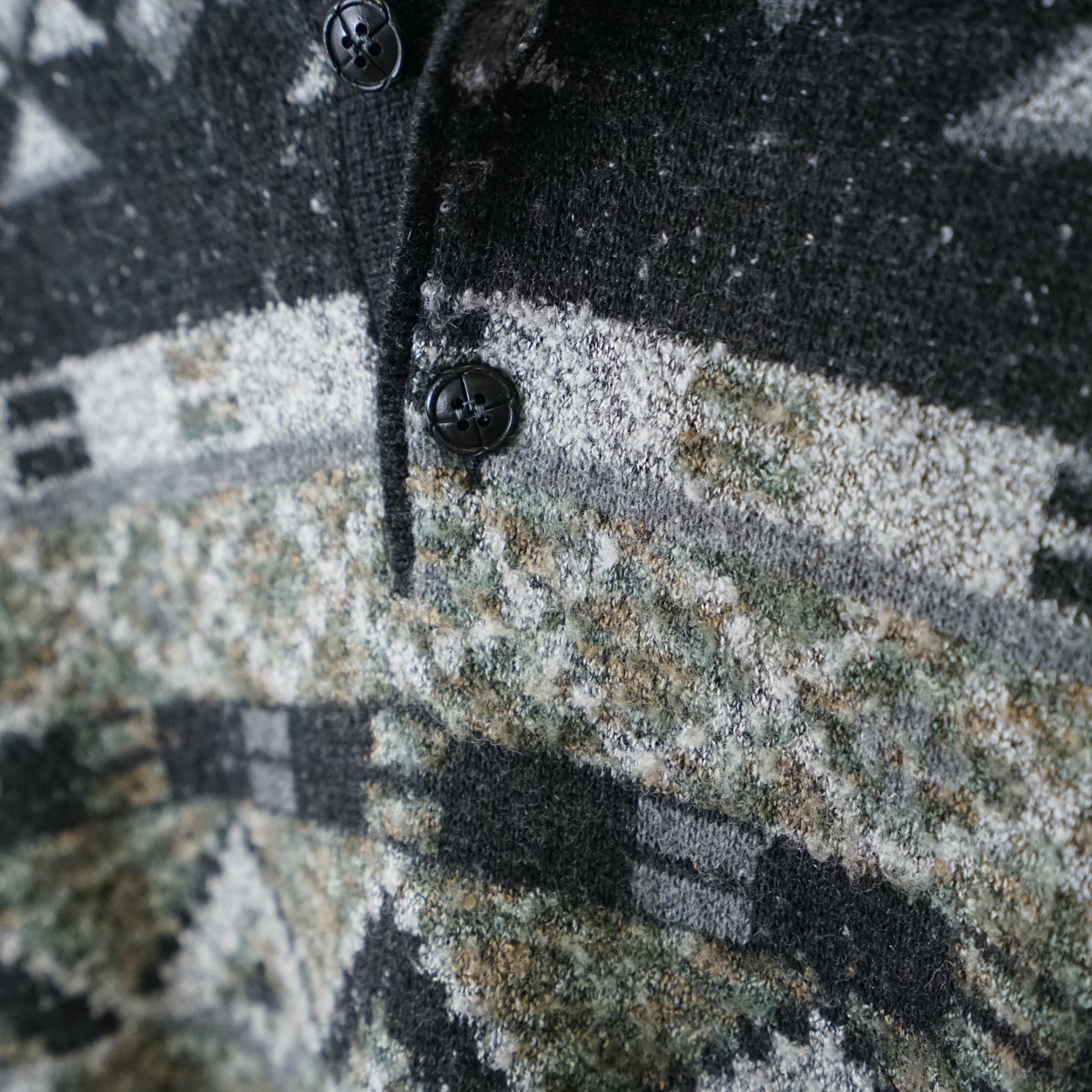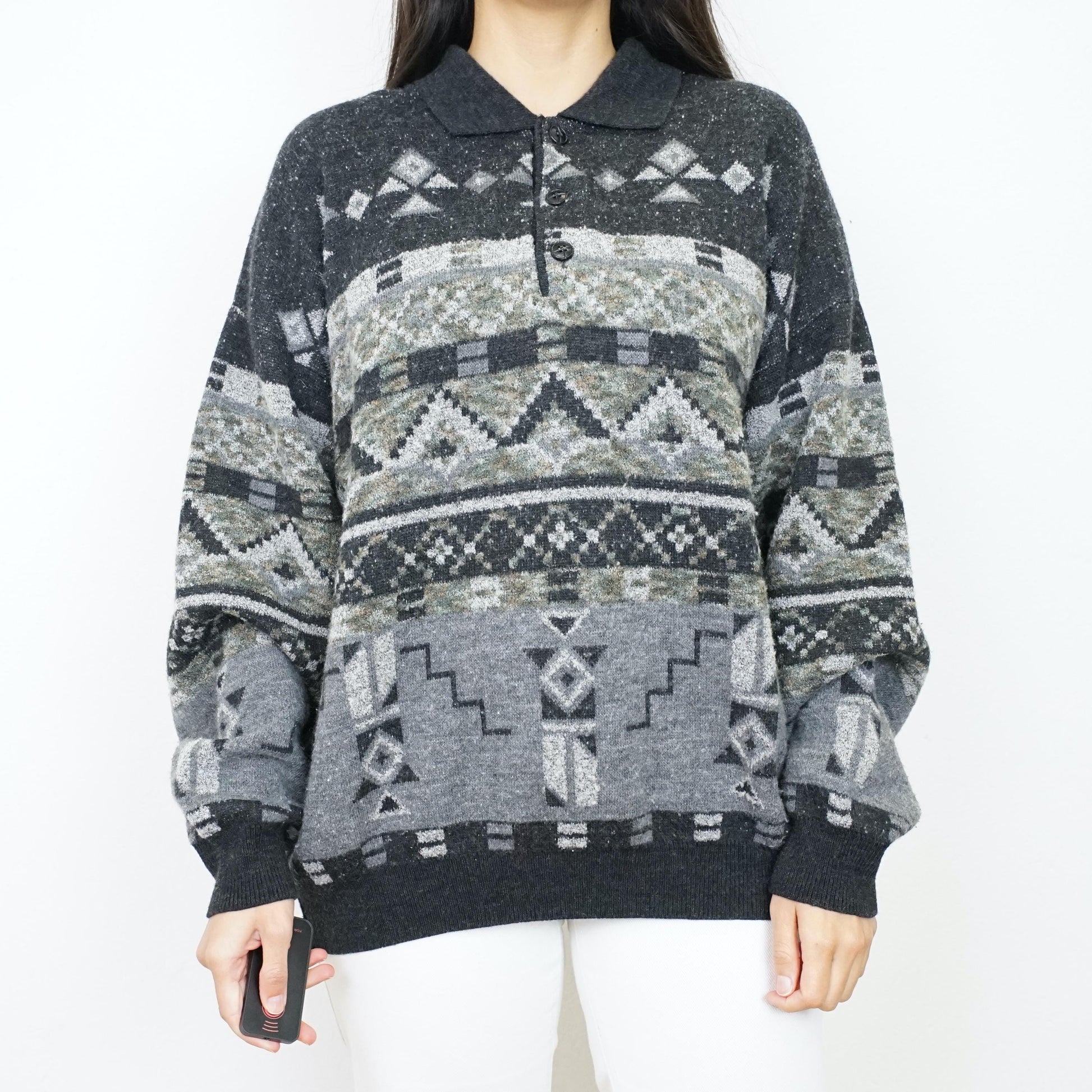 Vintage comfy knit polo pullover with geometric pattern in colors grey, black, white and green.
