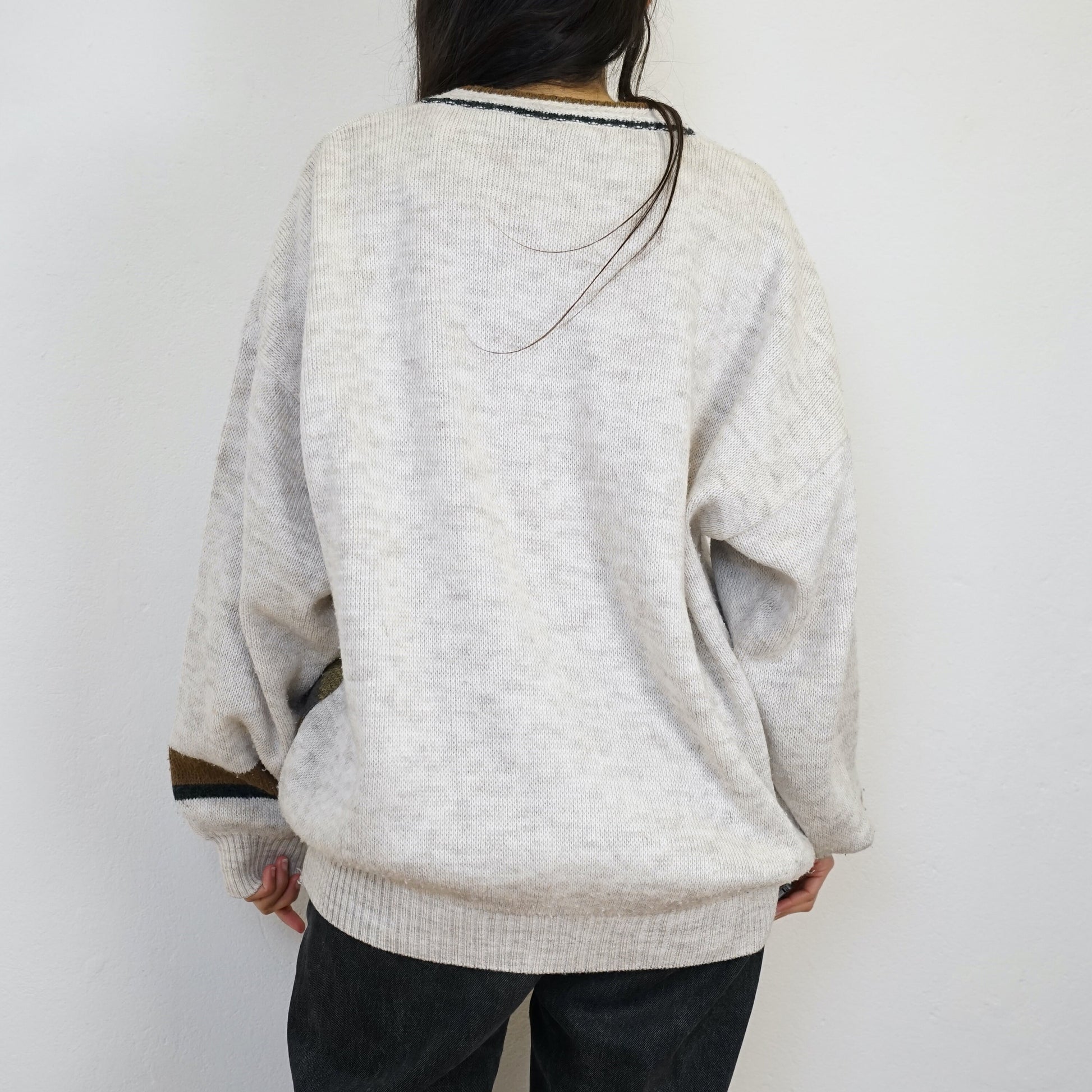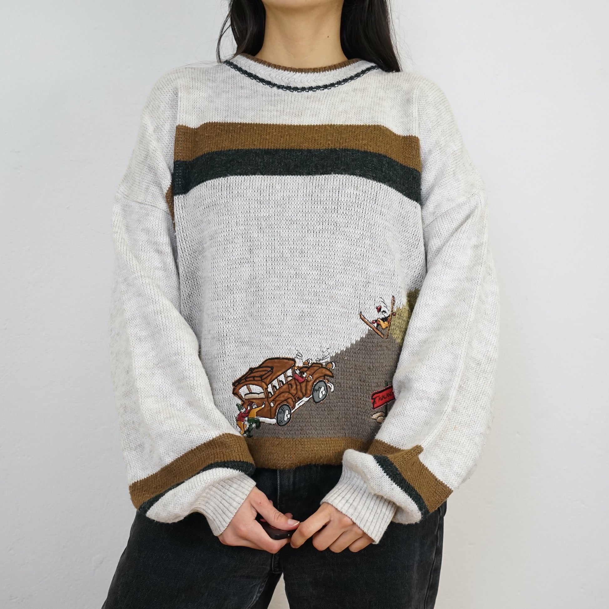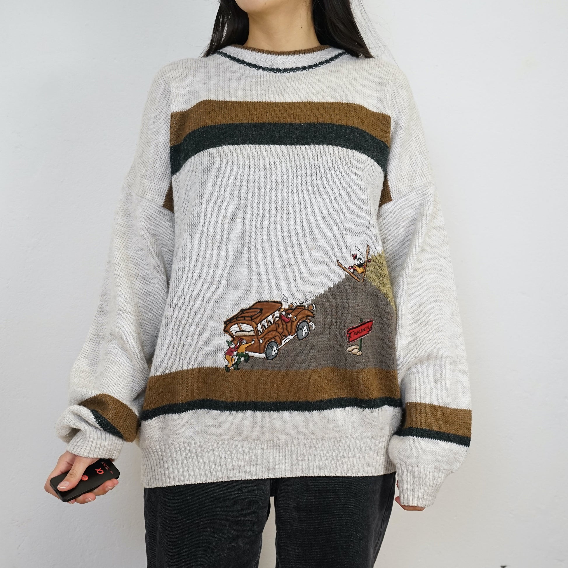 Vintage white knit pullover with brown, green, grey details and embroidery details of people pushing a car