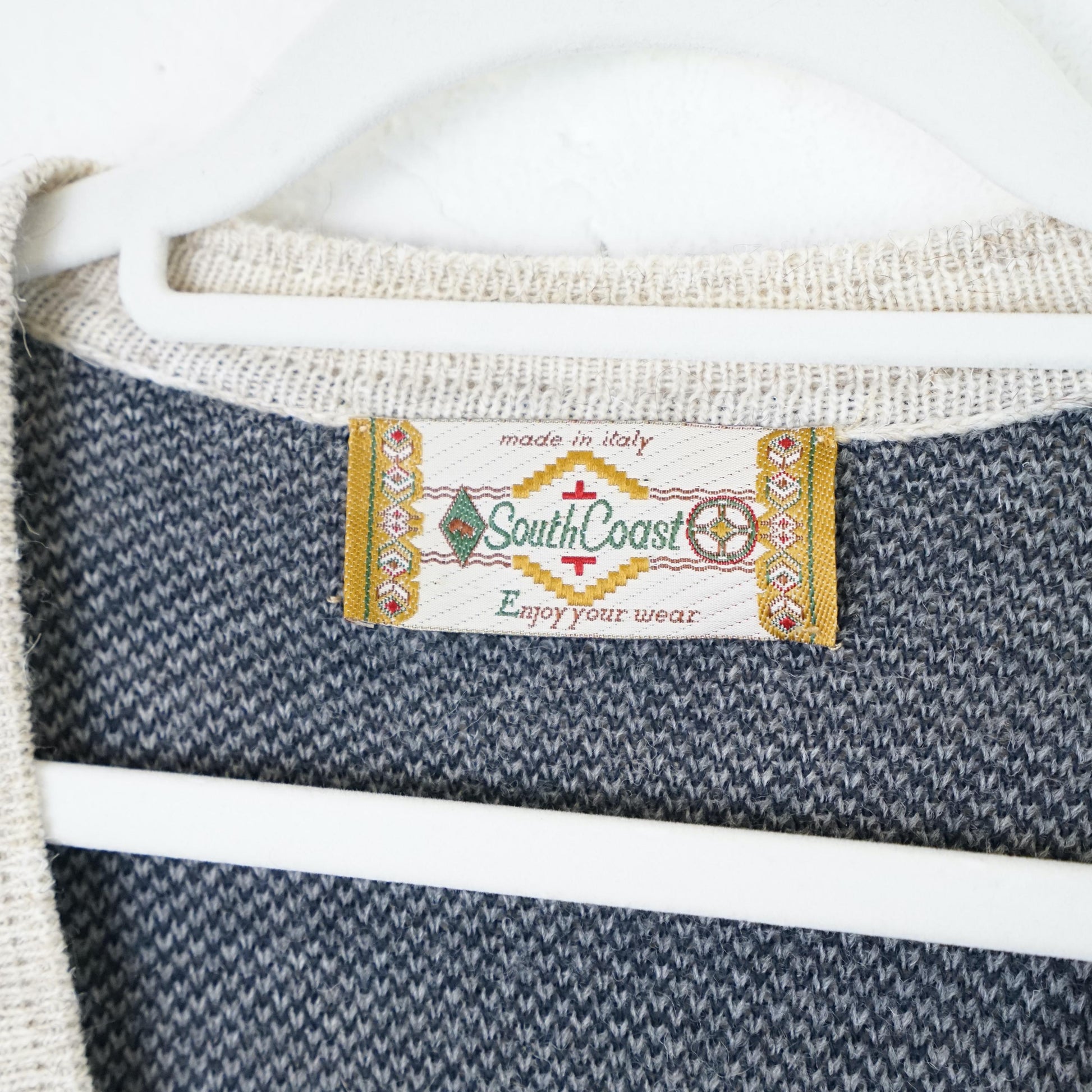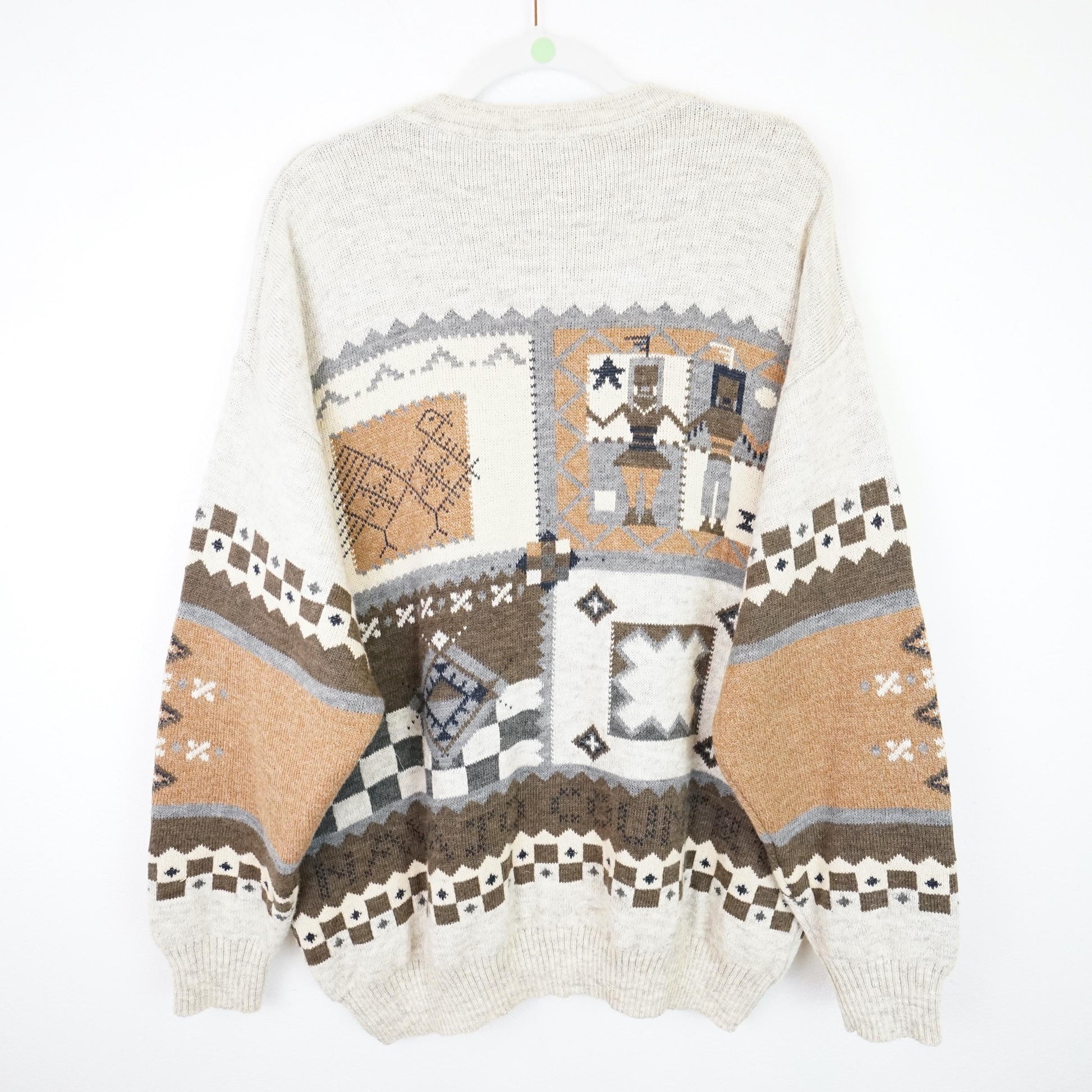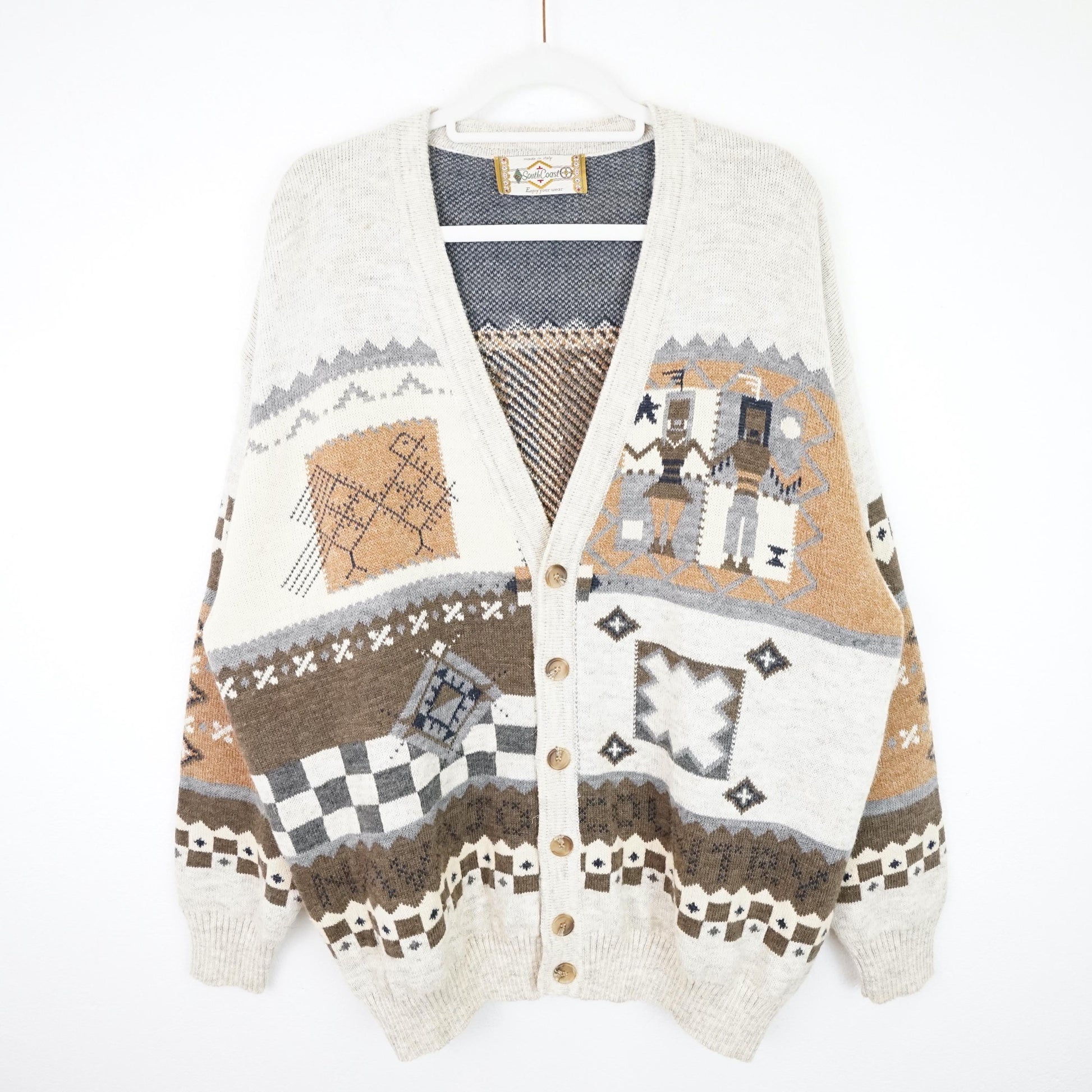 Vintage cream beige cardigan with geometric and people pattern. Material feels itchy on bare skin, better to wear something underneath.